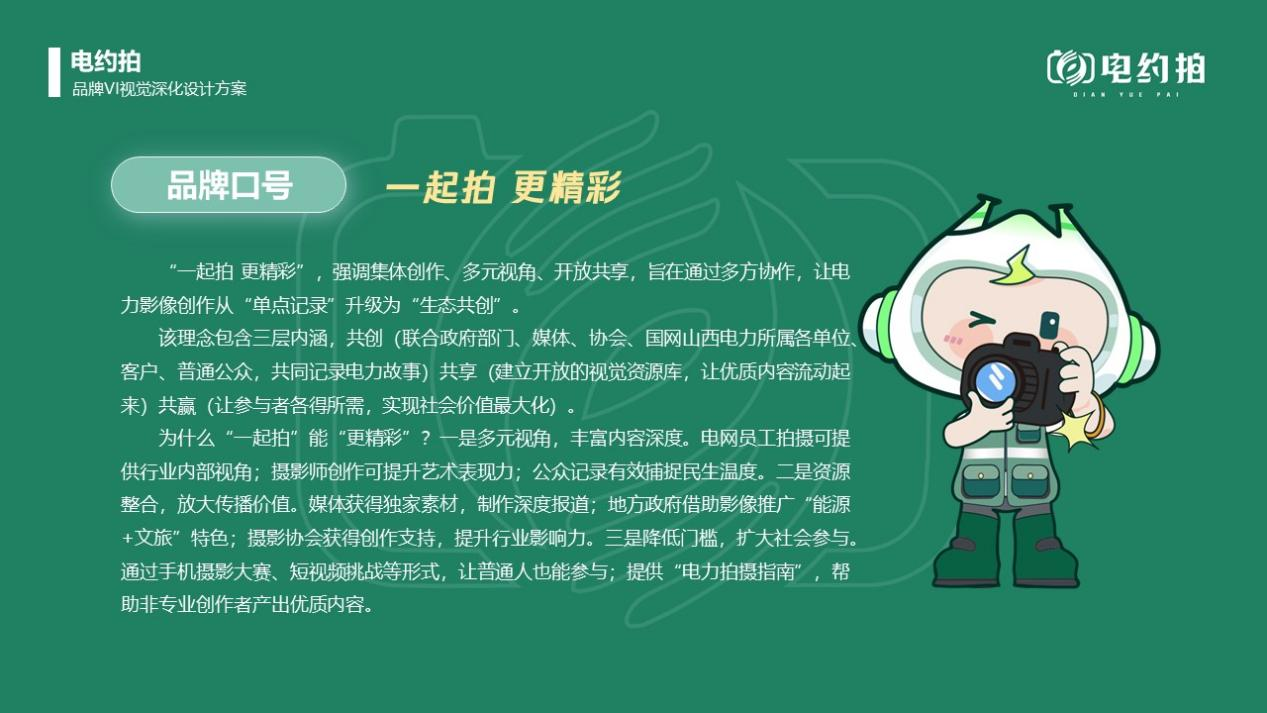 打造“電約拍”品牌,確定品牌定位、理念、愿景、口號、Logo、任務(wù),完成商標(biāo)注冊,編制品牌手冊,制作文創(chuàng)產(chǎn)品,通過聯(lián)合采風(fēng)、展覽推廣品牌。借助IP人物“晉電小新”影響力,增強(qiáng)作品內(nèi)容吸引力與互動性,提升“電約拍”品牌知名度、認(rèn)可度。