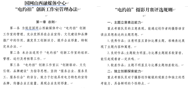 制定《“電約拍”創(chuàng)新工作室管理辦法》《2024年“師帶徒 青藍(lán)計(jì)劃”新聞采訪實(shí)訓(xùn)方案》《圖片資源管理系統(tǒng)管理辦法》《“電約拍”團(tuán)隊(duì)積分獎勵辦法》《爭創(chuàng)“七個最”宣傳成果工作方案》《“為美好生活充電 為美麗中國賦能”攝影月賽評選規(guī)則》《“電約拍”采風(fēng)承諾書》等相關(guān)制度,通過完善的管理機(jī)制和制度,推進(jìn)了項(xiàng)目規(guī)范化運(yùn)營、標(biāo)準(zhǔn)化管理。加強(qiáng)團(tuán)隊(duì)文化建設(shè),“電約拍——佳片有約”團(tuán)隊(duì)師徒8人,通過附加“葫蘆家族”情愫,打造出“記錄時代、匠心傳承”的團(tuán)隊(duì)文化。