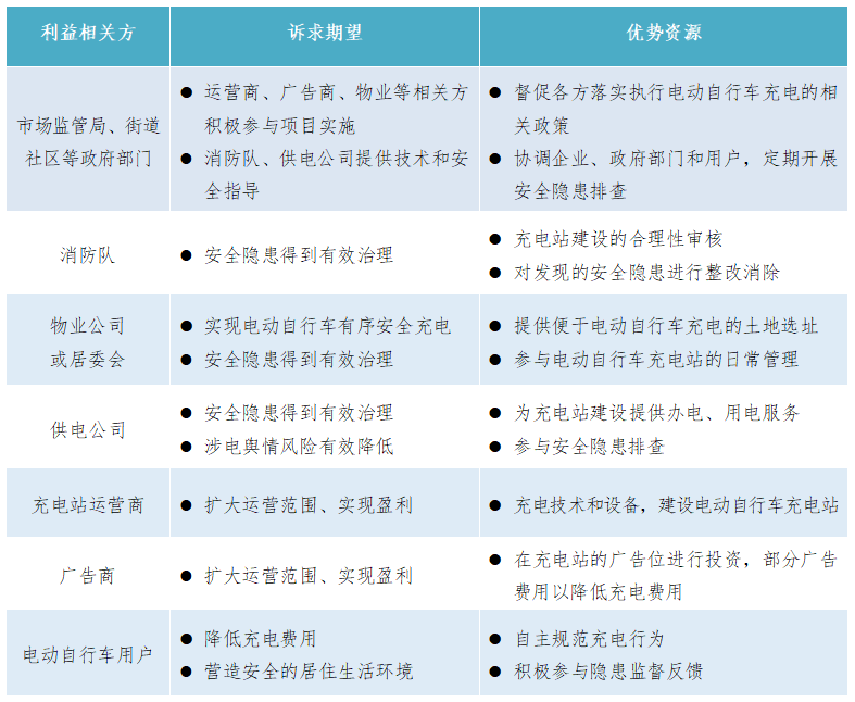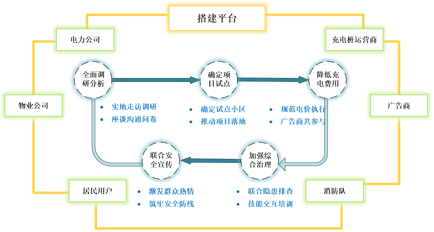 聚焦充電樁建設、運營運維、費用透明等重點難點,識別并引入街道社區(qū)、物業(yè)、消防隊、充電站運營商、廣告商等利益相關方,充分考慮各方訴求、期望,推動各方自愿融入、合作共贏,發(fā)揮各方管理優(yōu)勢、服務優(yōu)勢、技術優(yōu)勢。