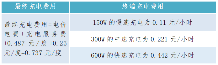 據市場統計,運營商充電服務費一般為:0.4-0.6元/度。為進一步降低充電費用,引入充電站廣告商,將廣告租金的60%補貼至充電站運營商,以降低充電服務費,根據盈利效益測算,同運營商溝通,可降低充電服務費至0.12-0.25元/度,按0.25元/度計算最終充電費用如下表所示。